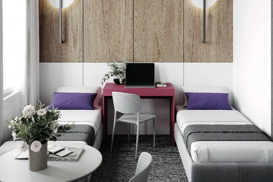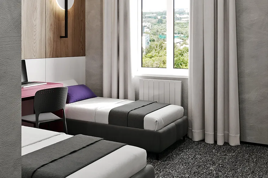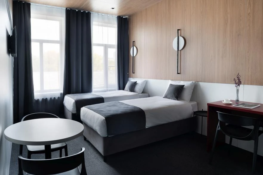 Площадь 14 кв.м. Вместимость – 2 гостя Две односпальные кровати Бесплатный Wi-Fi Телевизор Кондиционер Душ и санузел Комфортная рабочая зона